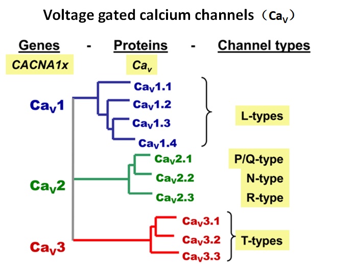 Voltage gated calcium channels are activated during depolarization of many different cell membranes and mediate calcium influx in response to action potential and subthreshold depolarization signals. Signal transduction of different cell types involves different voltage-gated calcium channel molecular subtypes. Four types of calcium channels (L, N, P/Q and T) have different physiological functions. L-type calcium channels are involved in the excitation-contraction coupling of muscle cells and the excitation-secretion coupling of endocrine cells and some neurons. N-type calcium channels are involved in the release of neurotransmitters. P/Q-type calcium channels are limited to repetitive peaks induced by Purkinje cell-mediated depolarization. T-type calcium channels mediate depolarization-induced repetitive peaks in endocrine cells and neurons.