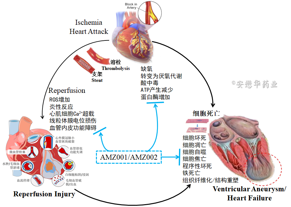缺血性心脏病 全球缺血性心脏病人超过2.5亿,是世界各国最常见的死亡原因,也是全球最大的医疗健康负担问题。心脏冠状动脉血管阻塞引起的心肌梗死导致组织缺氧、随之转变为厌氧代谢、引起酸中毒、ATP产生减少以及蛋白酶增加造成心肌组织死亡(如下图所示),引发恶性心律失常(室颤),是突发性死亡的主要原因。中国每年有超过100万人由于突发心肌梗死失去生命。 心肌缺血-再灌注损伤 心肌梗死病人及时就医,通过接受溶栓或经皮冠状动脉介入支架治疗,心肌缺血区的血供在一定时间内恢复,极大地降低了死亡风险。但血流恢复(Reperfusion)对原始缺血心肌造成进一步更严重的损伤,被称为心肌缺血-再灌注损伤,这种损伤与心肌ROS增加、炎性因子释放、Ca2+超载、线粒体膜电位损伤、血管内皮功能损伤有关,引起心外膜冠状动脉微血管舒张功能障碍、斑块破裂、血管阻塞、血流停滞、毛细血管淤堵/破裂出血,组织水肿,白细胞粘附/浸润,这些因素相互作用直接或间接地导致心肌损伤加剧。随之而来引起细胞坏死、凋亡、自噬、细胞焦亡、程序性坏死、铁死亡,组织纤维化/结构重塑。随时间推移室壁瘤形成,发生心力衰竭(如下图所示)。 心肌缺血-再灌注损伤的防治 虽然心肌缺血-再灌注损伤的发现已经超过半个世纪,目前临床对心肌缺血-再灌注引起的心肌损伤还缺乏有效的预防/治疗手段。虽然临床用腺苷(Adenosine)预防心肌缺血-再灌注损伤,但长期随访研究发现腺苷对心肌缺血-再灌损伤预防作用有限。因此,心肌梗死血流重建后不少病人发生心衰而重新入院,严重影响心血管病人的生存质量。 我们的核心产品 AMZ001/AMZ002 通过激活NAPMT/NAD+/Sirt1信号通路,抑制心肌缺血-再灌注引起的心肌ROS增加、炎性因子释放、细胞凋亡等(如下图所示),有效降低实验大鼠心肌缺血-再灌注引起的梗死面积(-70%),抑制心肌再灌注引起的恶性心律失常,我们正准备申报IND新药临床试验批件,以填补临床缺乏心肌缺血-再灌注损伤保护药物的空白。 |